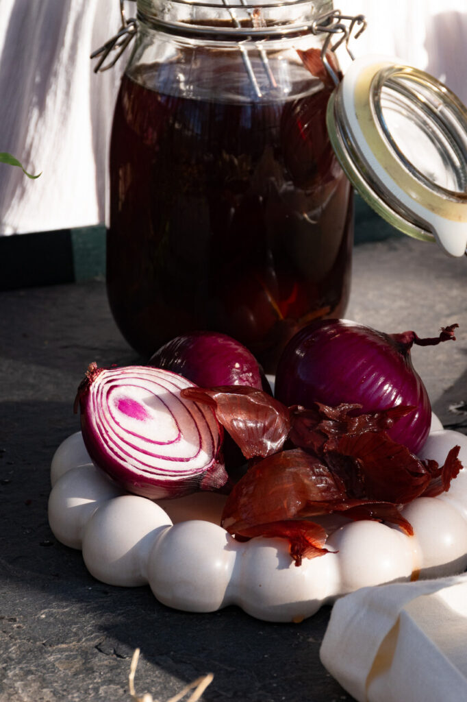 1) Fazer a “tinta”: ferver água com cascas de cebola