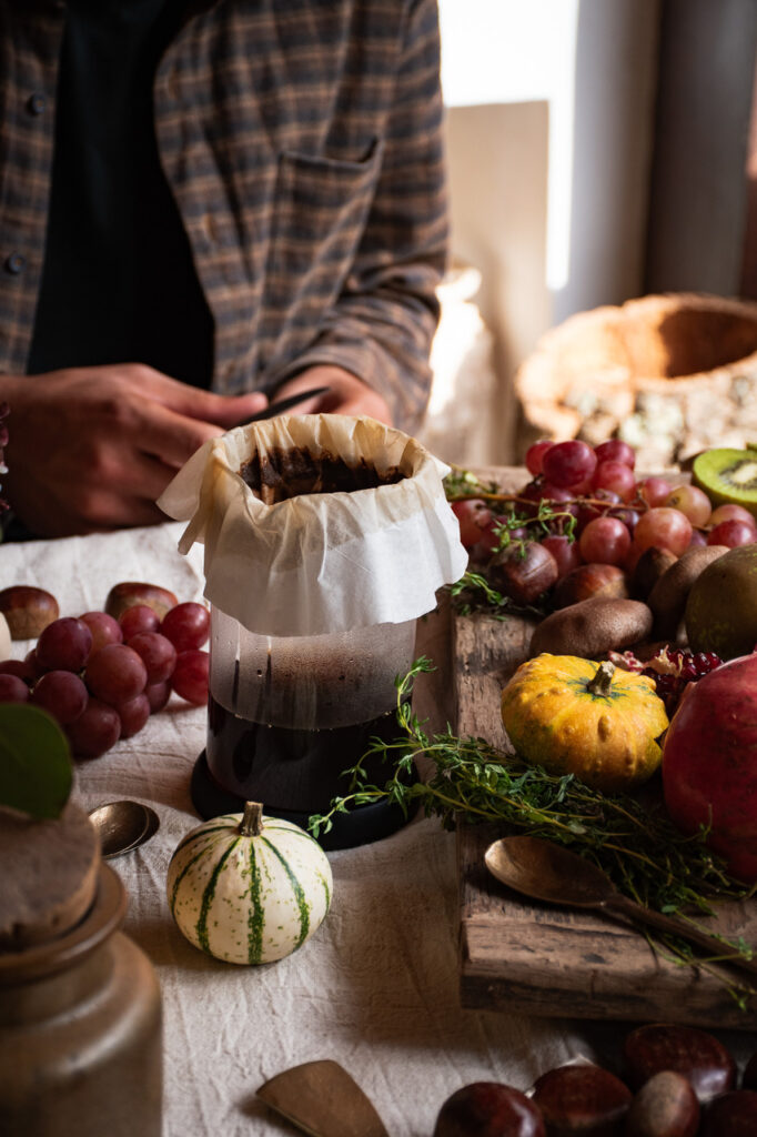 Linhos fluidos, vasos com marcas do tempo, tábuas com carácter, potes e talheres com história fazem o palco à mesa para as delícias da época que se fazem acompanhar do perfume mais reconfortante: o café.