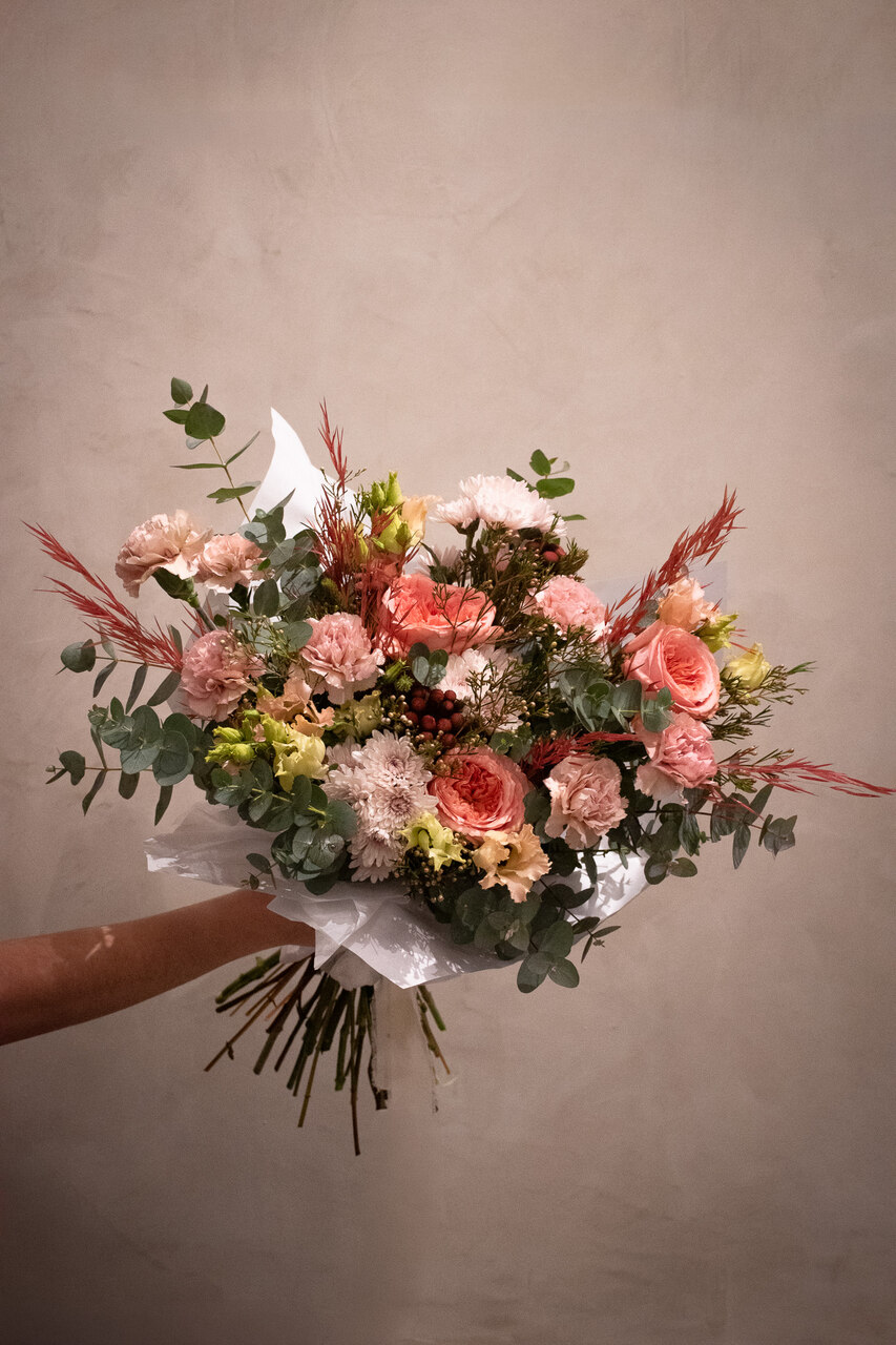 Ramo de Rosas Garden, Cravos chá, Margaridas, Brunias, Eustoma, Plumas, Flor de Cera e Eucalipro