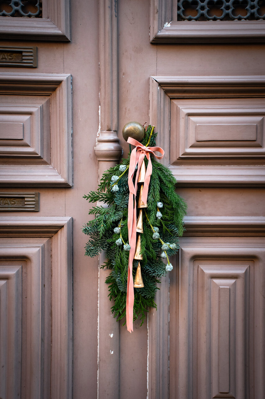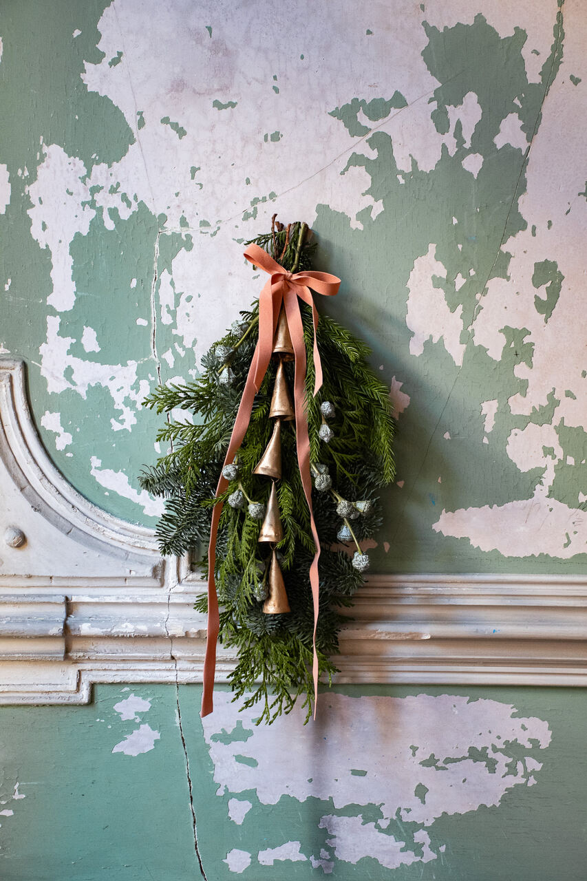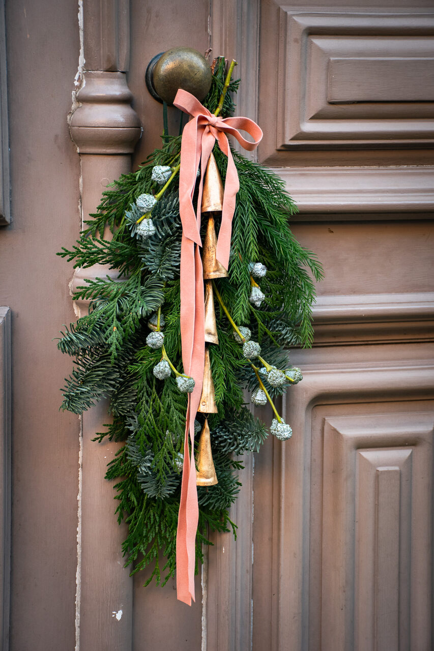 Welcoming Door com Hastes de Pinheiro e Cedrum, Haste de baga de Eucalipto, Laço e Sinos