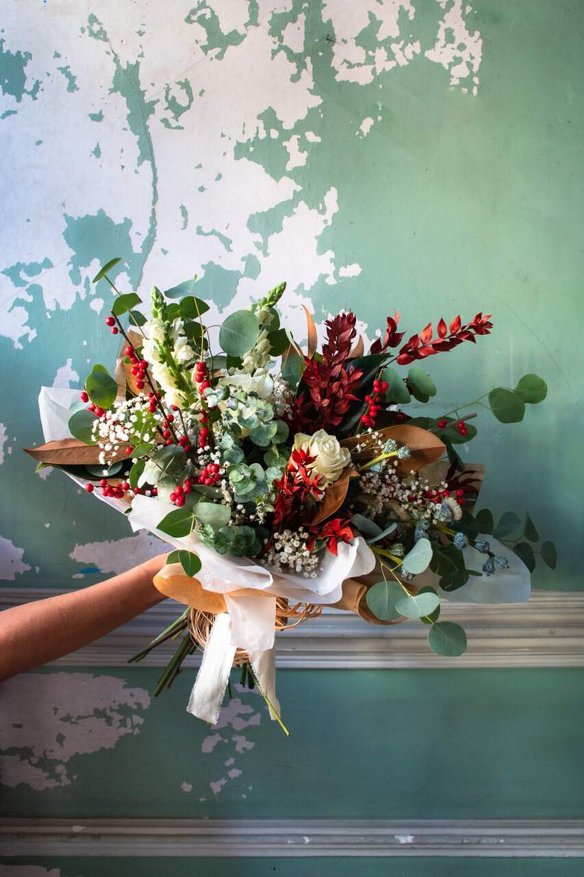 Ramo de Rosas, Antirrhinium, Ilex, Ruscus, baga de Eucalipto, Vivaz branco, Magnólia e mistura de eucaliptos