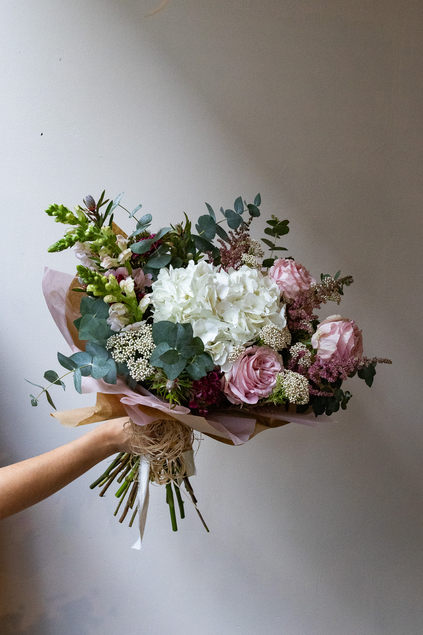 Ramo de Hydrangea, Antirrhinum, Rosas, Astilbe, Cravelinas, Flor de Arroz e Eucalipto