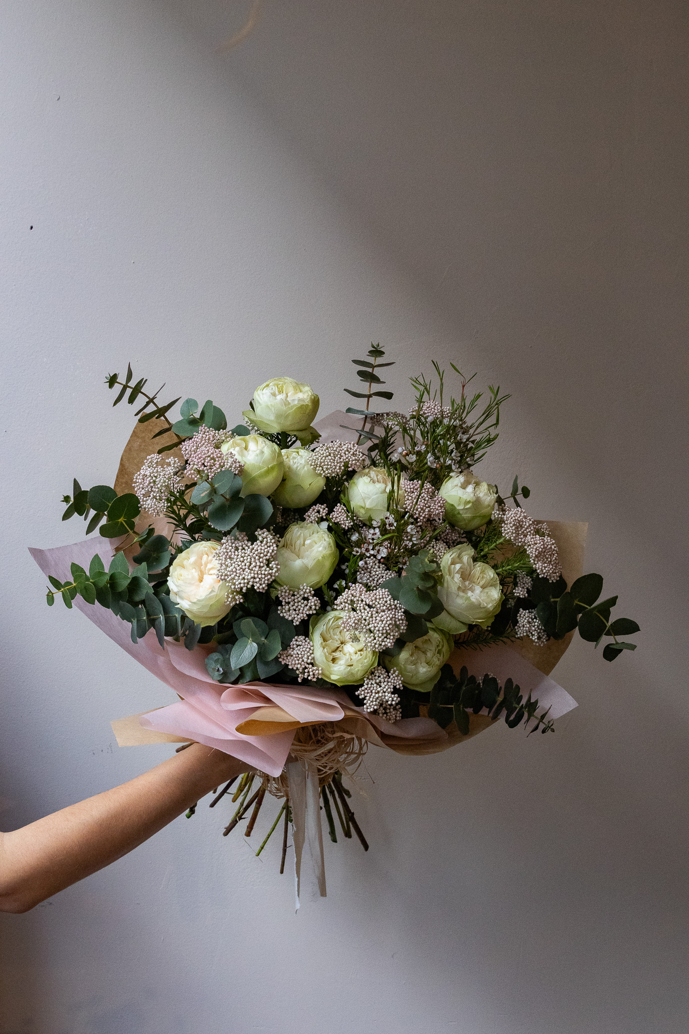 Ramo de Rosas Garden, Flor de Cera, Flor de Arroz e Eucalipto