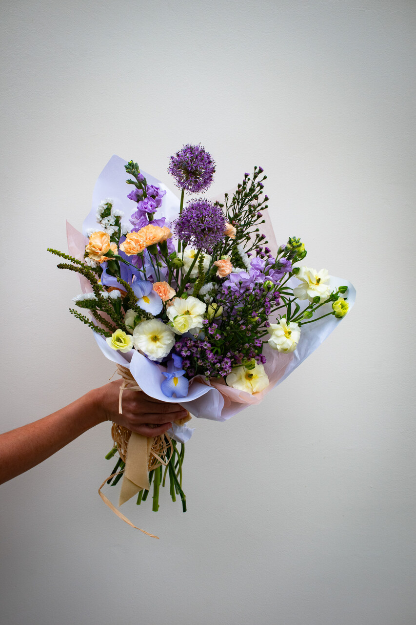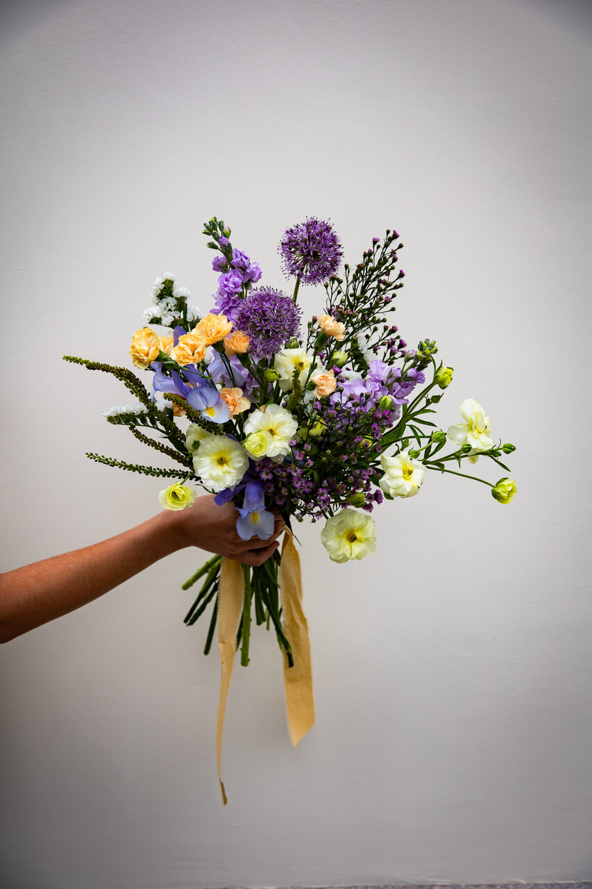 Ramo de Iris, Allium, Tulipas, Ranunculus, Cravinas, Goivos, Statice e Aster