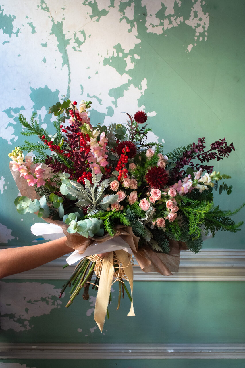 Ramo de Antirrinium, Rosa Santa Teresinha, Ilex, Echinopsis, Ruscos, Nobilis, Senécio e Eucalipto